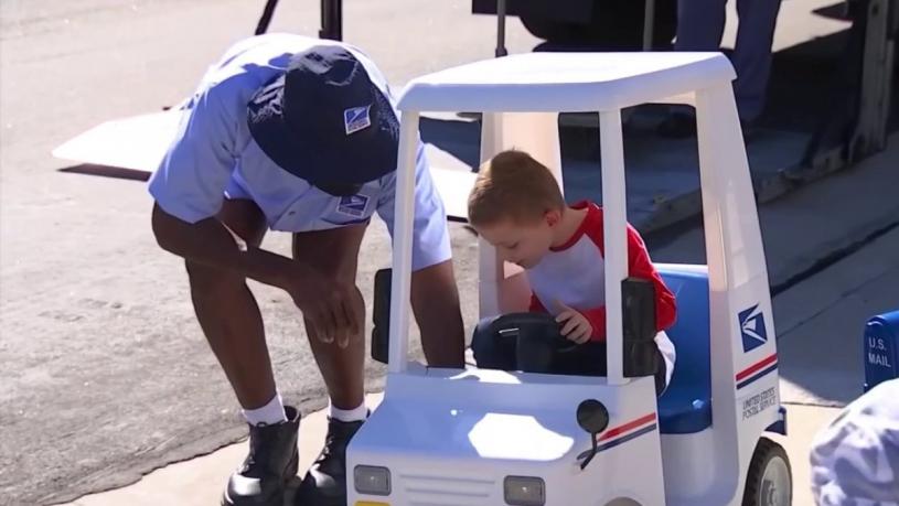 居住在南加州拉 古納尼古爾市(Laguna Niguel)一名六歲男童多年來 一直在與癌症作鬥爭,他最大夢想是 到郵局工作,美國郵政總局聽聞消息 後決定替他圓夢,任命他為城市榮譽 信差。