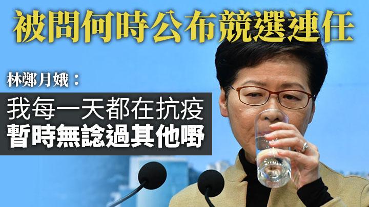 行政長官林鄭月娥今日召開記者會,除公布逸葵樓疫情回穩明早可如期解封外,亦宣佈現時沒有辦法可以微調或者放寬社交距離措施,現時全部社交距離措施延長2周至2月17日,全港學校暫停面授延長至2月21日。記者會上,林鄭月娥被問到何時公布競選連任,她指有留意到選管會已公布選舉提名期,但直言「我每一天都在抗疫,我暫時無諗過其他嘢」。