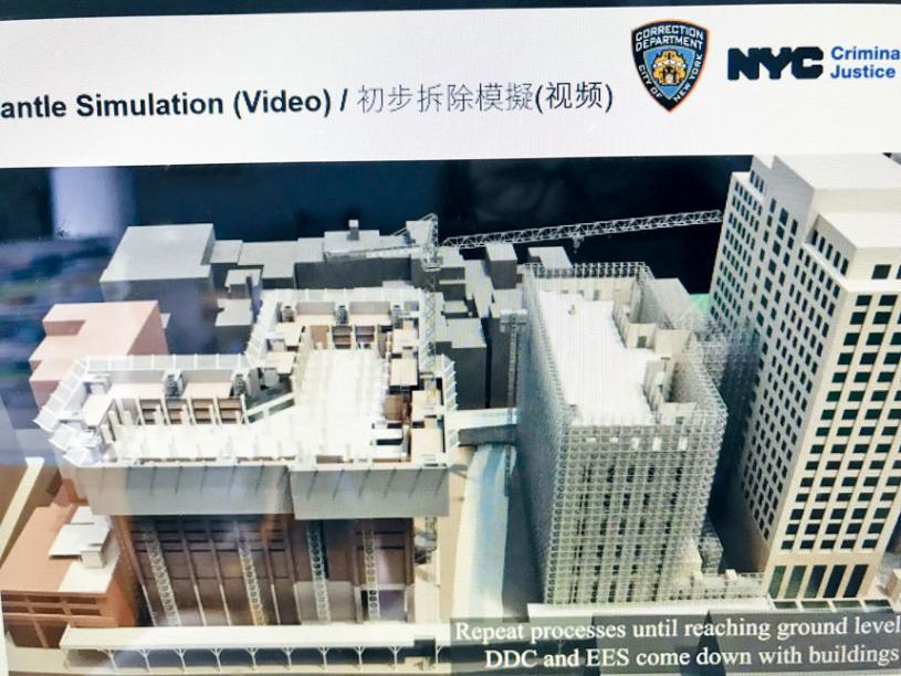 由於拆卸現時監獄行動即將展開,相關部門如市長辦公室司法改革部,市建築及設計部(Department of Design and Construction,下簡稱DDC),懲教署代表,連日來先後向第一社區委員及邀請數十華人社區參加視頻會議,及昨日為華文傳媒講解,令社區充份明白拆卸監獄的程序。1989年成立的專業拆卸集團Gramercy Group作為拆卸現在監獄的公司,該公司為監獄拆卸的過程如何在噪音、交通、振動、灰塵等減緩等作詳細報告。
