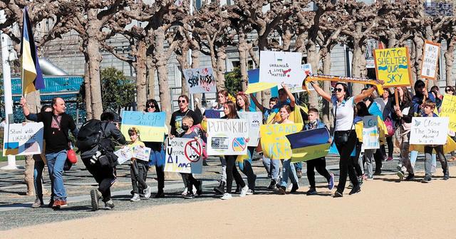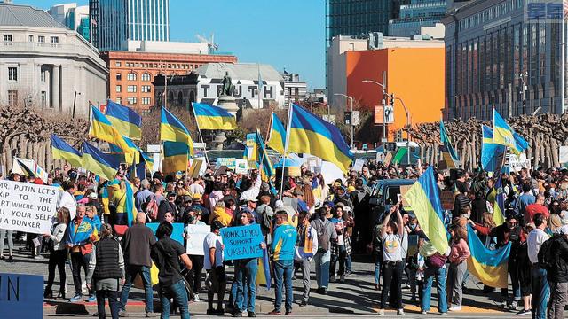 繼前一天周六的示威遊行後,灣區上千名烏克蘭裔人士27日再度行動,在三藩市市政廣場發動更大規模的示威活動。許多是全家大小一起出動,舉著藍黃兩色的烏克蘭國旗、身穿藍黃兩色的衣服,舉著各式的標語,抗議俄國入侵烏克蘭,要求俄國立即撤軍。一些來往當地的車輛也高按喇叭,為示威者加油打氣。