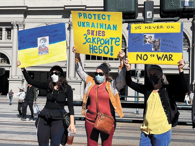 知名反戰團體粉紅代碼「Code Pink」、Speak Out Now、UFCLP等,星期天在三藩市渡輪大樓(Ferry Building)廣場舉行示威集會,聲援烏克蘭,譴責俄羅斯發起的侵略戰爭,過百名烏克蘭裔居民以及社會各界人士參與其中。