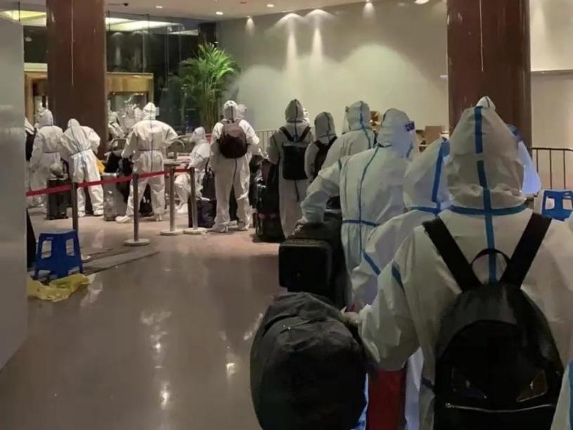 華亭賓館爆發疫情後,在六日淩晨將全員轉移至其他酒店。陳彤回憶,「淩晨三點,華亭賓館把整棟樓的人叫起來,給我們每人發防護服,讓我們到樓下排隊等巴士。全樓幾百個人在排隊,連電梯都根本出不去。大廳裡站滿了人,其中也有孕婦,甚至有人暈倒了。」