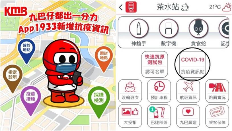 九巴表示,第5波新冠肺炎疫情持續,市民對抗疫資訊甚為殷切,旗下手機應用程式「App1933」前日(9日)已啟動新增功能「抗疫資訊站」,整合各項抗疫資訊及服務,包括確診及圍封地點、採樣檢測中心、指定診所、疫苗接種中心及預約抗疫專用的士等,提供一站式實時抗疫資訊。