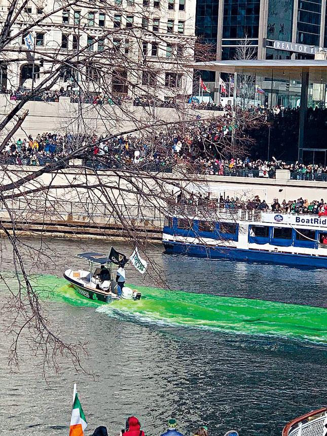 芝加哥慶祝聖派翠克節、最令市民與遊客歡騰的當屬於「染綠芝加哥河」,當芝加哥河水在當天早上漸漸被染成深綠色時,人們似乎也看到春神的腳步已經慢慢的走近芝市。