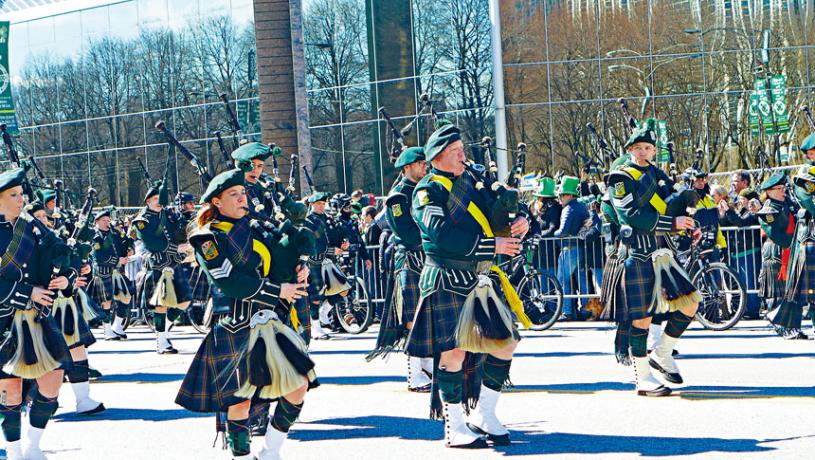 遊行有數十隊銅樂隊、啦啦隊與遊行方陣,沿著哥倫布大道精神抖擻的前進,聖派翠克大遊行絕對不可缺的是愛爾蘭的風笛隊、一路上高昂悅耳的愛爾蘭樂曲響徹在雲霄,愛爾蘭美少女的踏踏舞最吸睛,只見她們穿著刺繡精緻的舞裙、兩條細長的腿一路踢踢嗒嗒的展示著優美的舞姿,博得圍觀群眾歡呼叫好聲。今年還有小馬、小狗等愛護動物協會的第一次參與遊行,他們聲稱這些小馬、小狗都是特別培訓的,有些還可以充當「狗醫生」「小馬醫生」去慰藉身心受創傷的兒童、老人與病患。