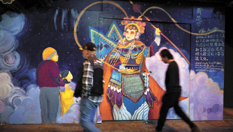 華裔藝術家鄺楚瑩在都板街一座廢棄的劇院前,用重彩描繪穆桂英的戲劇形象,回憶兒時隨外婆去看粵劇的情景;大明星戲院門道上,張貼著一張年代久遠的海報,記錄著名的廣州粵劇團曾漂洋過海來華埠演出;影友李敏雄拍攝的兩張黑白照片顯示,大明星戲院座無虛席,一輛折疊的輪椅上是一束將要送出的鮮花、樂譜微弱的燈光映襯著樂師的身影。當影像剝離了艷麗的彩色,還原了影像的純粹,也沉澱了具有歷史性的某個片段。