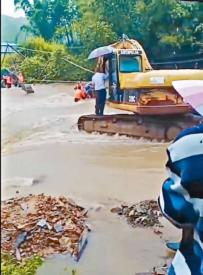 在清遠英德,一輛防汛工作汽車突遇山洪爆發,連人帶車被洪水衝走,其中兩人獲救,三十一歲的英德市黎溪鎮黨委委員李鼎新失聯。當地村民拍攝的救援現場影片顯示,落水車輛被洪流推至下游,汽車被卡在橋洞,救援人員出動了多台挖掘機搭成臨時通道進行救援。