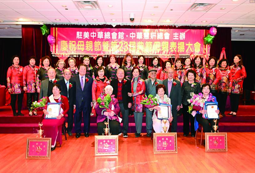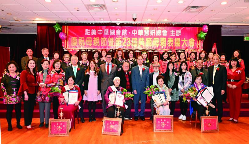 中華總會館、中華慧妍總會於5月6日中午假座華埠康年酒家聯合舉行「慶祝母親節暨第23屆典範母親表揚大會」。州財務長馬世雲、三藩市估值官郭華健;市參事佩斯金、馬兆明;密布爾市議員馮嘉輝、前任市長李偉忠;州參議員威善高、州議員丁右立、楊馳馬、市參事陳詩敏、市府律師邱信福等委派代表前來祝賀;中華總會館總董暨寧陽主席黃中華、肇慶總會館主席司徒仲山、岡州總會館主席黃國康、三邑總會館主席關家澄;中華慧妍總會會長徐蘭英、大會主席柯維玲、法律顧問郭麗蓮、鄧孟詩;創辦人暨名譽會長李人芝;名譽會長方謝潔霞、雷溫玉嬋、高慧琍、李鍾美薇、楊瑞明;創會永遠董事彭李碧珍;創會顧問李啟文、名譽顧問蕭挺、方創傑;第一副會長蘇淑君、第二副會長張曉春、第三副會長劉李美芳;名譽董事長胡林眉、中文書記沈黎碧鳴、英文書記黃廖雪萍;董事柯維玲、熊素珍,董事黃筱雅、吳賽英;會員司徒玉萍,以及各僑界首長、嘉賓出席慶會。名譽董事嚴莉兒擔任大會司儀。大會主席柯維玲致歡迎詞,她表示中華慧妍總會舉辦母親節表揚大會,迆今己至第23屆。二十多年來,我們不斷在社區中,選拔出總共超過百位母親楷模。今天,我謹代表大會在此恭賀四位模範母親。誠摯地 恭賀您們榮獲這項殊榮。實際上,在場的每一位,以及所有千百萬的母親,一直在默默付出,都是值得關註和表揚。她感言母親的生命歷程是一生的承諾。從孩子出生直到成長離家,母親的工作甚至延續至下一代,未曾卸下重擔。兒女的成就,是母親最欣慰和最驕傲的收獲。不論孩子們曾經歷過任何事件或困難,不年齡長幼,母親永遠是在場的及時雨,不離不棄。母親永遠潤澤培育,指引訓導。無懼建言,保守護佑。原諒過失,平撫哀傷。給予力量,誠擊祝禱。母親的感情是充沛的,心是柔軟的,但個性卻堅毅勇如梨石。今天,慧妍總會聯同中華總會館,宗旨在服務社區,表彰典範母親,發揚母愛的光輝。袁心感恩與會者全力的支持,使大會順利成功。祝福所有母親佳節愉快,幸福安康。