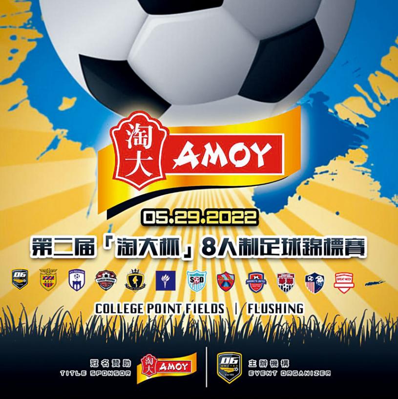 2022年大紐約地區華人球壇首樁盛事,AMOY淘大食品公司冠名贊助,06聯足球體育會(06 UNITED FOOTBALL CLUB)主辦,第二屆「淘大盃」8人制足球賽,定於5月29日早上9時到傍晚6時,假法拉盛COLLEGE POINT FIELDS大學點足球場隆重舉行。