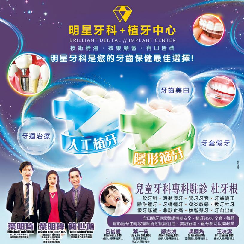 由著名牙醫畢業於波士頓大學、紐約聖保醫院醫師葉明琦牙醫博士(Mitchell Yeh, DMD)與同是國際口腔植牙專科醫學院院士的簡世鴻博士(Alan Chien, DDS)及哥倫大學膺複補綴假牙專科牙醫葉明瑋博士(Vivian Yeh, DDS MS)共同主理位於布碌崙、法拉盛的「明星牙科中心」。並誠邀五位畢業於美國名牌大學牙醫——紐約大學的呂俊毅牙醫(Charles Lu, DDS)、兒童專科醫生葉一荷(Lily Y. Ye DDS, MSc)、紐約大學牙醫鄭志鴻博士(Albert Cheng, DDS)、吳國雋牙醫博士(Dr. Jonathan Wu)、王映潔牙醫博士(Dr. Liz Wang, DDS)加盟。