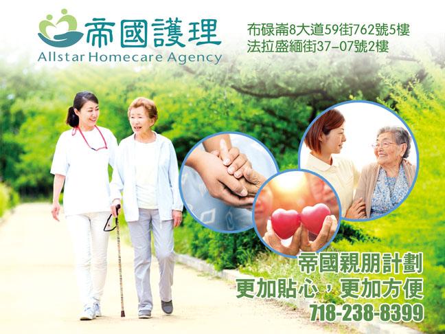 帝國家庭護理公司(ALLSTAR HOMECARE AGENCY, INC.)是一所由紐約州授權的家庭護理機構。帝國家庭護理公司服務區域涵蓋紐約五大區:布碌崙、皇后區、曼哈頓、布朗士、史丹頓島、長島納蘇郡。在紐約五大區為無數名病人提供了熱忱、專業、高質、免費的家庭護理服務。他們致力於提供高質量的衛生保健,讓病人能在自己熟悉的家庭環境下得到最好的照顧,CDPAP親人護理計劃自由選擇親屬或朋友,病人可選家人、朋友作為自己的家庭護理,無需證書。帝國家庭護理公司現正免費申請長/短期家庭護理服務,急需五大區護理人員。
