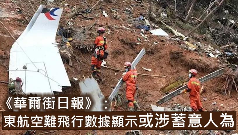 《華爾街日報》周二(17日)以「東航黑盒顯示是人為蓄意俯衝」標題報道,不具名人士透露,美國官方初步評估,飛行數據顯示駕駛艙內有人故意將波音737客機垂直俯衝撞毀,又指這架飛機是依照駕駛艙內「某人的指示行事」,也不排出是飛機上其他人闖入駕駛艙,故意造成墜機,而美國調查人員焦點,已轉至機組人員行為身上。