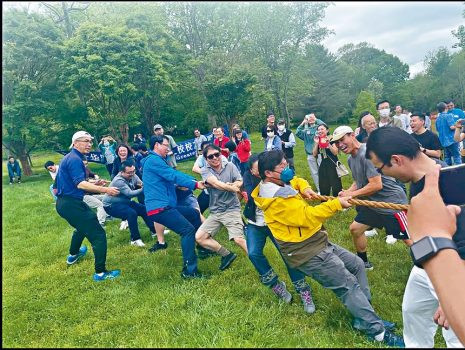 緊接著,大專聯黑山公園千人野餐燒烤聚會的重頭戲——拔河比賽登場了!經過A,B,C,D+E亭一番激烈的分組賽後,D+E亭終於一路披荊斬棘贏得了今年拔河比賽的冠軍!祝賀D亭和E亭的南京大學,湖南高校所有校友們!熱烈酣暢的拔河比賽的同時,還有由大專聯副會長張樂介紹華府著名的天涯樂隊,為大家用兩個薩克斯風,一個鍵盤演奏耳熟能詳的優美的音樂吶喊助威!拔河比賽結束之後,楊青女士還為美亞杯助力北京冬奧活動的跑步健行騎車獲獎者頒發了各項獎項,感謝大家強身健體,以實際行動支持奧運精神!
