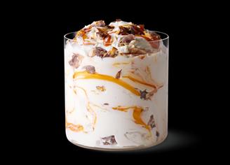 每一份麥旋風都以麥當勞香濃馥郁的香草霜淇淋爲底,搭配包裹著巧克力的椒鹽脆餅片,再加上一圈濃郁的焦糖,正好成爲甜與鹹的完美組合。