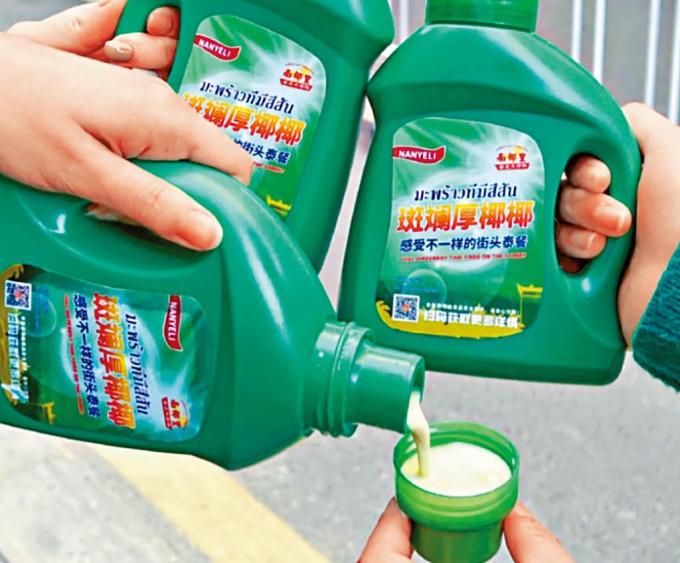 這款吸睛無數的「洗衣液奶茶」名為「斑斕厚椰椰」,綠色的外包裝酷似洗衣液,內裏其實是泰式奶茶,售價十八元一桶(五百毫升)。甚至有商家加價代購,一杯售價三十八元。