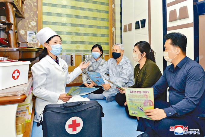 (星島日報報道)北韓周三通報新增二十三萬二千八百八十人「發燒」,另有六人死亡,累計一百七十二萬人發燒、六十二人死亡,六十九萬多人仍在接受治療。當局並未說明多少人新冠採檢呈陽性,只稱出現發燒症狀。北韓上周四首度證實出現Omicron BA.2新冠個案。北韓官媒中央通信社昨報道,領袖金正恩主持執政勞動黨政治局會議時,抨擊國家對第一波疫情因應「不成熟」,指責官員能力不足、怠惰,增加了對抗疫情的「艱巨性」。世衞公共衞生緊急計畫執行主任萊恩周二指出,新冠病毒在未接種疫苗人口中高度傳播,例如北韓,將增加形成新變種毒株的風險。圖為平壤一名女醫生家訪民居,宣揚防疫意識。
