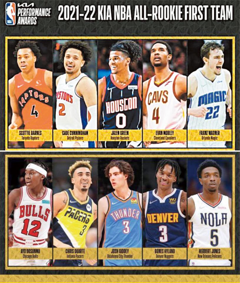 年度最佳新秀陣容具體結果為,最佳新秀一陣:坎寧安、巴恩斯、莫布里、傑倫.格林和小瓦格納;最佳新秀二陣:杜阿爾特、道蘇姆、吉迪、赫伯特.瓊斯和海蘭德。