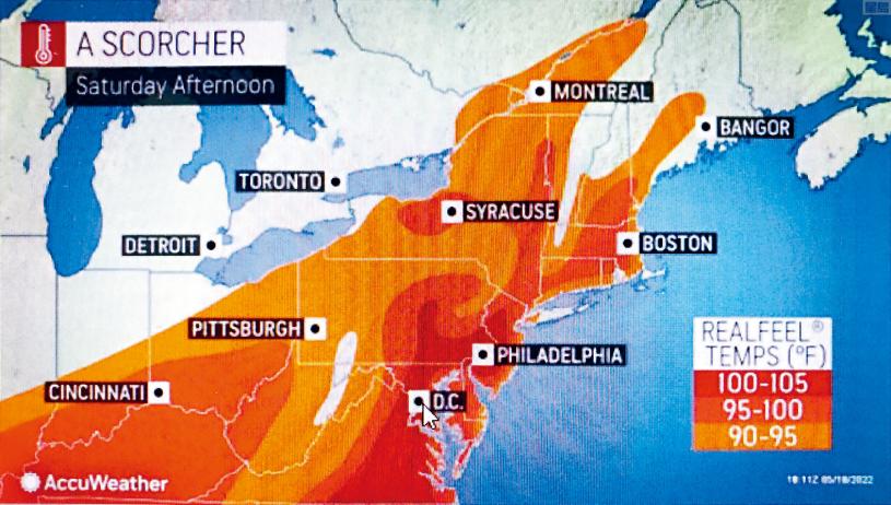 綜合《華盛頓郵報》及網媒《Axios》報道,東岸廣泛地區在這波熱浪中,將有數以百萬計人口受到影響,其中95號州際公路從維珍尼亞州至麻省沿線,21日的氣溫將突破90度,比正常水平高出20度左右,部分地區的氣溫可能打破當地的5月紀錄,預測高溫會在22日到達高峰,屆時影響1.25億人。