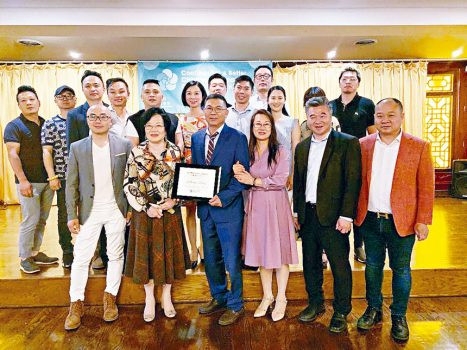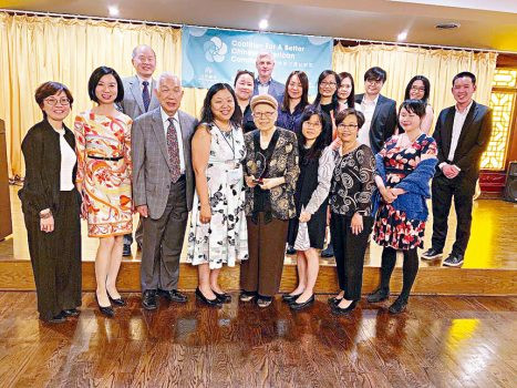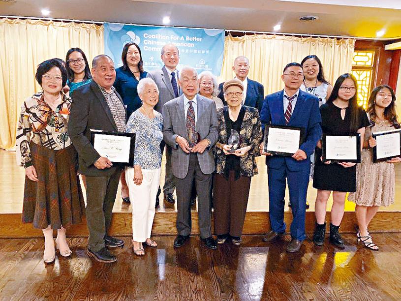 美中餐飲協會會長、福建總商會前會長鄭時坦(前左3)榮獲「卓越社區領袖獎」,同仁們歡欣若狂。梁敏育攝