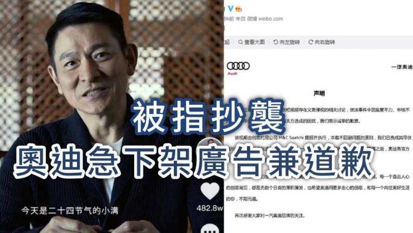昨(21日)是中國的小滿節氣,奧迪(Audi)汽車公司發布了與劉德華合作的新廣告片《人生小滿》,其後擁有粉絲300多萬的抖音網紅質疑廣告抄襲其去年的舊作,引發廣泛關注。今(22日)上午,奧迪急在官方微博發布致歉聲明。
