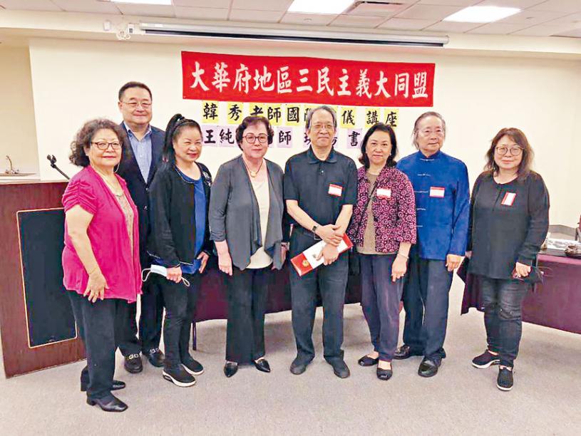 5月15日下午,大華府地區三民主義大同盟假座華府僑教中心會議廳舉辦講座,邀請到華府名作家韓秀主講「國際禮儀」,著名書法家王純傑現場揮毫。王純傑擅長以豐富的筆觸詮釋點、線、行氣間筆墨運轉之美,書法獨具一格。韓秀女士是美國外交官薄佐齊的夫人,曾多年隨外交官夫婿出使各國,對國際禮儀的應用都是親身體驗,韓秀熟知外交禮節,她深闇東西方文化的差異,對旅美華人在相關禮儀中的困惑,幫助甚大。