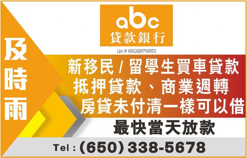最近灣區成立的ABC貸款銀行就是為了解決所有貸款者難題的貸款機構,這家總部設在南加州的貸款機構是一家實力雄厚,信用特高的公司,其分別在南加州及各地設有分公司,為很多有需要應急資金週轉的人仕提供最全面的服務,由於他們的手續簡單,放款效率夠快,因此甚受當地有需要的人歡迎。ABC貸款銀行的業務範圍廣泛,有各種不同形式的扺押貸款,商業週轉貸款等,最近更擴闊貸款範圍,為新移民/留學生買車貸款,就算是房貸未付清一樣可以借,相信必有一種適合你的需要,並且最快更可以在當天批核,即時當天放款,解決你資金困難的問題。