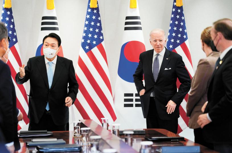 拜登21日與尹錫悅舉行首次會談。在會上拜登表示,美韓同盟過去數十年始終是地區和平繁榮的主軸,對於遏制朝鮮的威脅至關重要。他又指,美韓同盟建基於「共同犧牲」,未來會加強貿易和科技方面的合作。尹錫悅也表示,韓美將致力建立全球全面戰略同盟關係,共建基於規則的秩序。