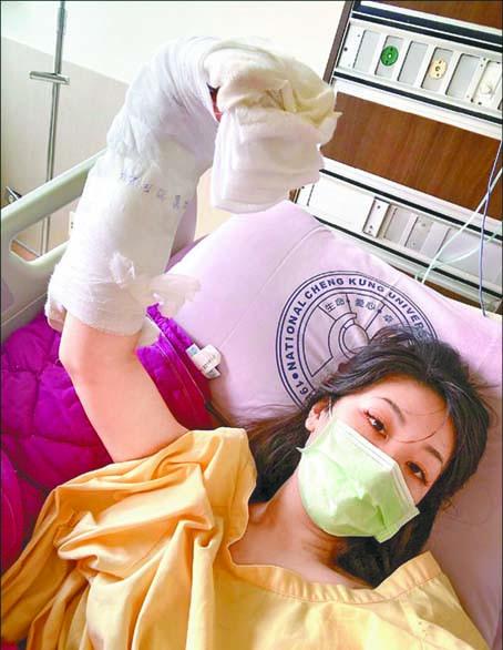 劉明湘日前回台南照顧父親,沒想到整理家裏時不慎撞破玻璃,右手被玻璃碎片劃傷,緊急由救護車送醫,經過3個多小時的手術,縫了10多針,至今仍餘悸猶存。