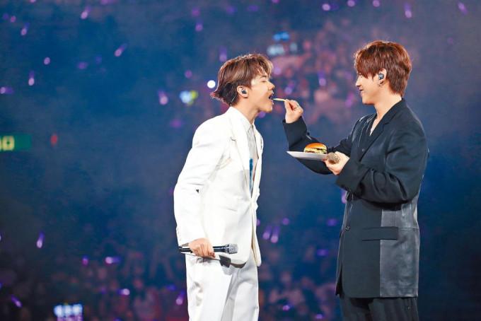 姜濤佩戴卡地亞珠寶、在掌聲雷動下閃耀登場,二人來個互相擁抱外,姜濤還帶了最喜愛的漢堡包、薯條送給軒仔,更親自餵軒仔吃薯條,再自己偷吃了一條,場面十分搞笑!軒仔又讚姜濤好可愛,以當晚的聲勢,開個人演唱會都沒問題。