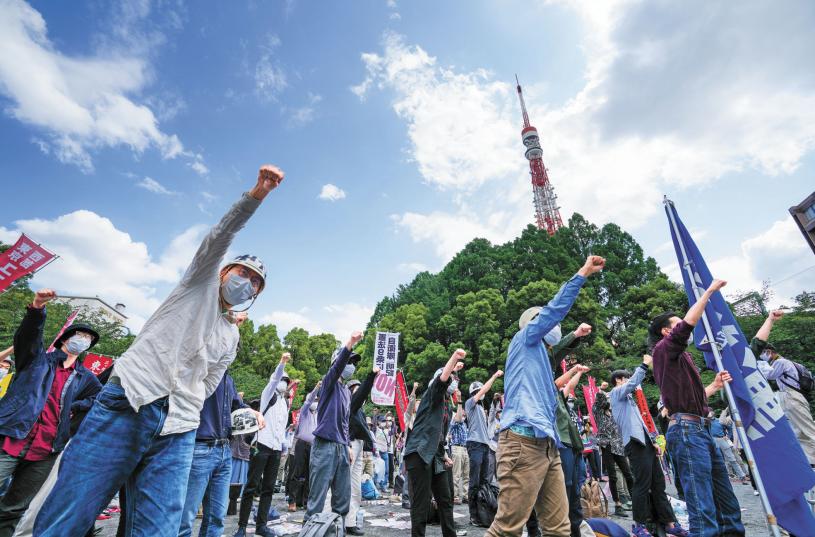 集會結束後,示威民眾紛紛走上東京街頭遊行,高喊「反對戰爭」、「反對四方安全對話」、「防止修憲」等口號。