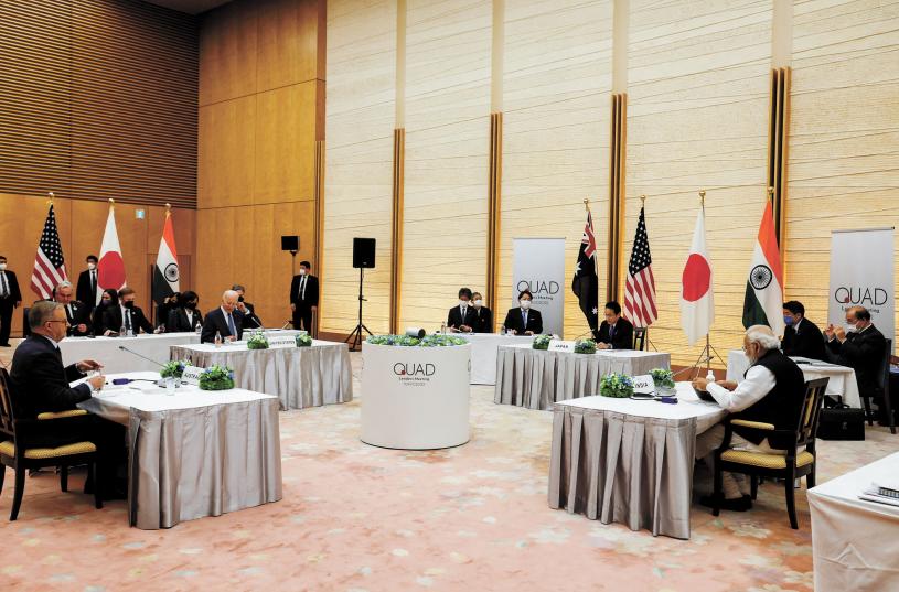 美日印澳「四方安全對話」(QUAD)峰會24日在東京面對面舉行。日媒率先報道準備發表的共同聲明草案內容,稱四國有意在5G及生物科技領域,強化官民合作,藉此對抗推動「軍民融合」的中國。分析認為,由於印度在烏克蘭等安全議題上和美國、日本、澳洲不同調,四方對話似已從安全架構轉向經濟議題。
