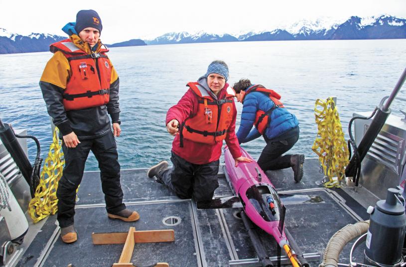 這天,在波濤洶湧的阿拉斯加州復活灣(Resurrection Bay)冷風中,坐在阿拉斯加大學費爾班克斯(Fairbanks)分校研究船「納努克」(Nanuq)的眾人,目光全放在灰色水面上,看著一架5呎長、亮粉紅色的水下滑翔機浮上水面。