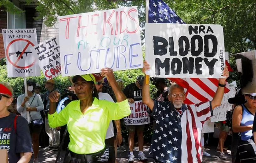 德州烏瓦爾德(Uvalde)校園慘案發生後,全國步槍協會(NRA)舉辦年度大會,不少民眾在會場外聚集,要求政府加強管制槍械,而在大會現場,前總統特朗普致詞時表示,學校老師應配備槍支並接受訓練,以此保障學生安全。