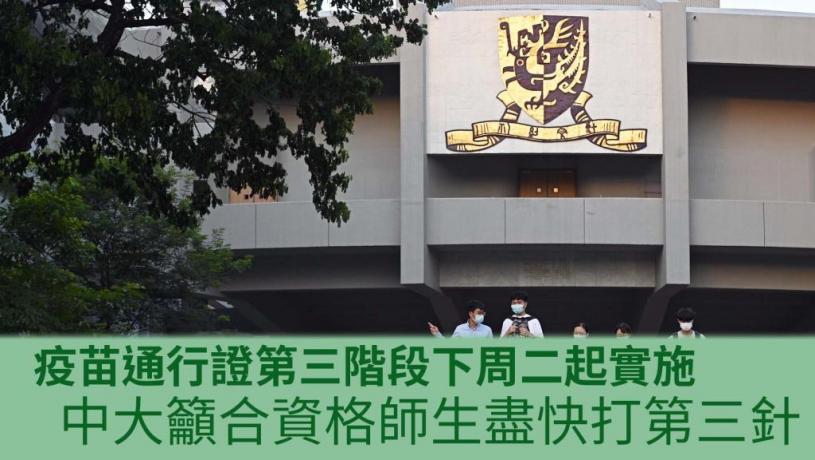 「疫苗通行證」第三階段將於下周二(31日)實施。香港中文大學緊急應變小組提醒師生盡快採取行動,確保個人健康及順利進入校園,並強烈建議中大員生若符合資格,須在情況許可下盡快接種第三劑新冠疫苗。