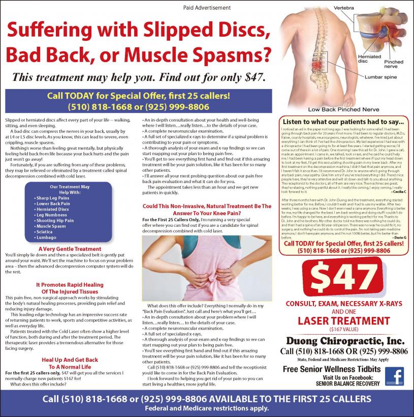 您有脊椎盤突出、腰背疼痛、或肌肉痙攣問題嗎?楊醫生採用無痛、非手術、非藥物的 – 最新「脊椎減壓手法和冷激光治療」,奏效減輕疼痛,改善腰背力量,強化脊椎穩定,使以下各種痛症得到改善和治愈!