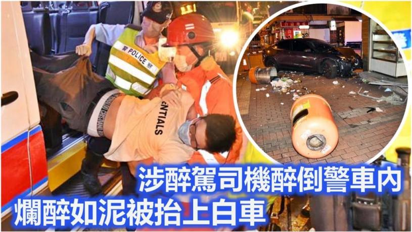 長沙灣一名26歲休班警員,凌晨懷疑酒後駕駛,失控剷上行人路,撞毀一間麵包店的外牆,並撞傷一名32歲男途人後始停下。一身酒氣的司機被捕後不勝酒力,醉倒警車內,需由救護員合力抬落擔架,再由救護車送院檢查。期間,司機的長褲鬆脫,露出內褲。