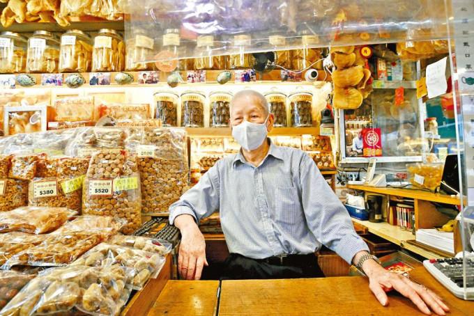 面積逾千呎的金城海味,已扎根區內六十六年,店面掛住六、七塊至少超過半米的魚翅,櫃上擺着一排戰前已製作好的花膠。現年九十一歲的林城是該店店東,他笑稱店內「好多古物」,更憶述「同啲街坊幾廿年,幾代都幫襯我,由媽咪介紹個女,再介紹個孫」。