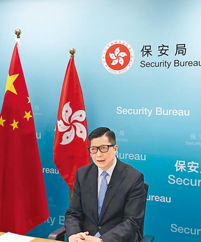 他認為,上述的成果清楚證明《香港國安法》的實施已發揮相當成效,而特區政府會在情報、執法、《基本法》第二十三條立法、宣傳教育方面採取策略,應對內部和外部的國安風險。他指,截至目前,共一百八十六人因涉嫌從事危害國家安全的行為和活動而被警方拘捕,當中一百一十五人被檢控,另有五家公司因涉嫌干犯危害國家安全罪行被檢控。在法庭審訊方面,八宗在目前已完成審訊,涉及十個人的案件,所有被告皆已被定罪,目前最高判刑是監禁九年。