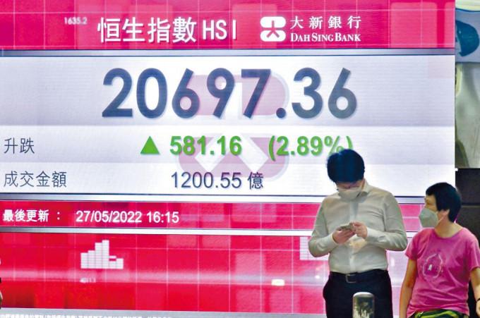 (星島日報報道)外圍氣氛回暖,加上中概股狀態大勇,阿里巴巴(09988)帶領一眾科網股推動港股大反彈,昨日恒指大升581點,收報20679點,在50天綫止步,將全周跌幅收窄至僅19點。北水連續15日淨流入,但昨日縮減只得4.1億元。分析指,科網股業績推動港股有進一步反彈空間,後市有機會上試21300點,如投資氣氛好轉,或有力挑戰22500點。