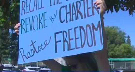 未接種疫苗者不能參加畢業典禮,5月31日洛杉磯格拉納達山特許高中(Granada Hills Charter High)外集會抗議。