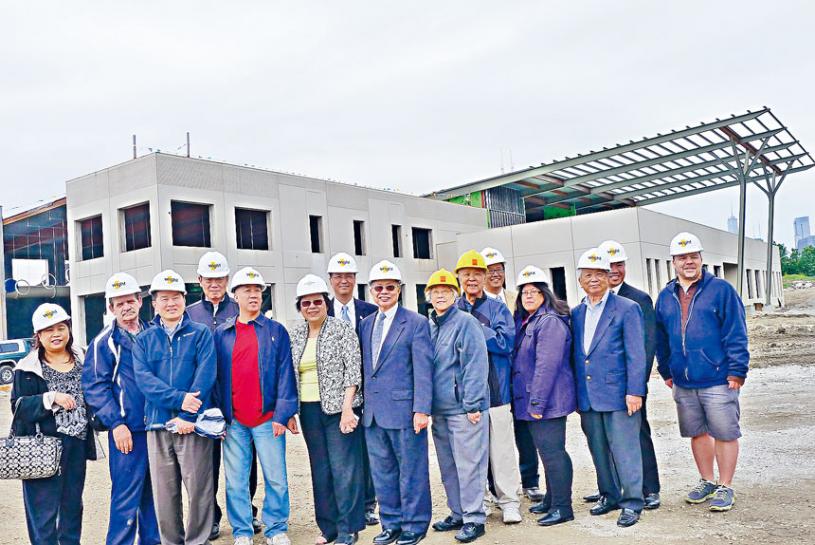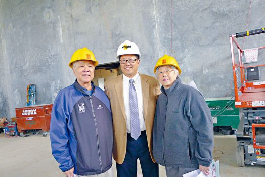 盡一生為華埠爭取修建體育館的謝祖諒(左)、萊特工程建築公司的建築師麥延凱(中)、謝祖諒的夫人謝依蓮(Elaine,右)當年在工地合影。梁敏育攝