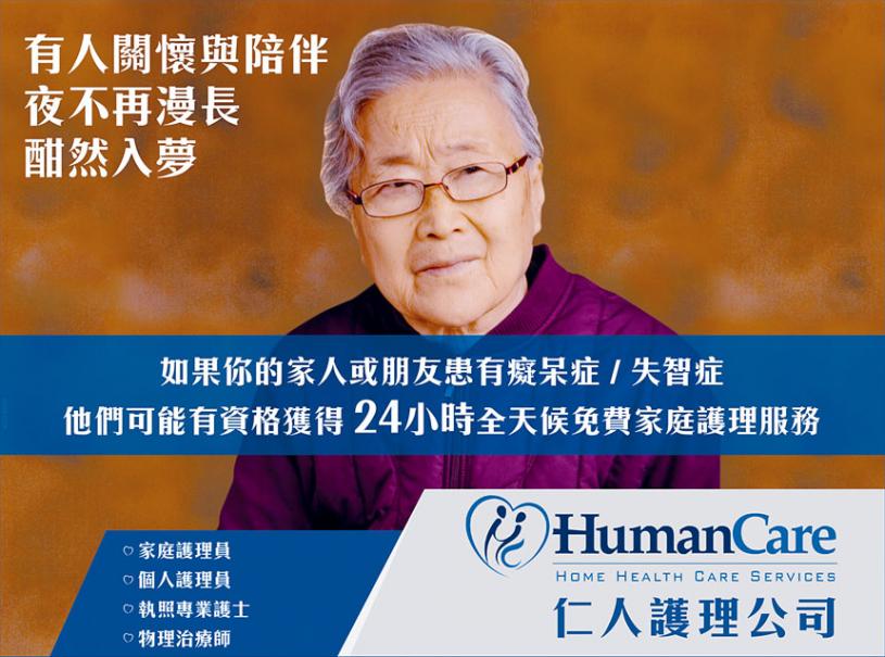 仁人護理公司(Human Care Home Health Care Services)是一所由紐約州衛生局頒發執照的家庭護理機構,仁人護理公司服務區域涵蓋紐約五大區:布碌崙、皇后區、曼哈頓、布朗士、史丹頓島、長島納蘇郡。多年來為無數病患提供優質全面的家庭護理來滿足醫療上和日常生活上的需要,仁人護理公司承諾為被照護者提供專業、愛心和熱誠的家庭健康護理服務,深得社區高度讚譽,有口皆碑。
