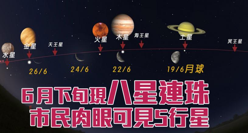 天文愛好者要留意,6月下旬將會有罕見天文現象「八星連珠」,八顆太陽系星體會在夜空連成一線,其中6月25日清晨更會是最佳觀賞時機。