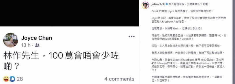 昨日林作就挑機Derek驗DNA一事,再在社交網發文:「我宣布:我今早獲得陳家私下回覆,距離探究究竟是隔代遺傳還是隔壁遺傳又近了一步。過去兩小時Follower只多了200人,這樣吧,IG到達40K,我就會post出完整回應。Facebook page上此post上到1K like我也會post。如果post出嚟唔收貨,我切。包震撼。」不過有網民對林作的行為表示反感,留言:「因為你這個post,我unfollow你」、「其實關你咩事」,更有人突破盲點:「我對你爸爸比較好奇」。