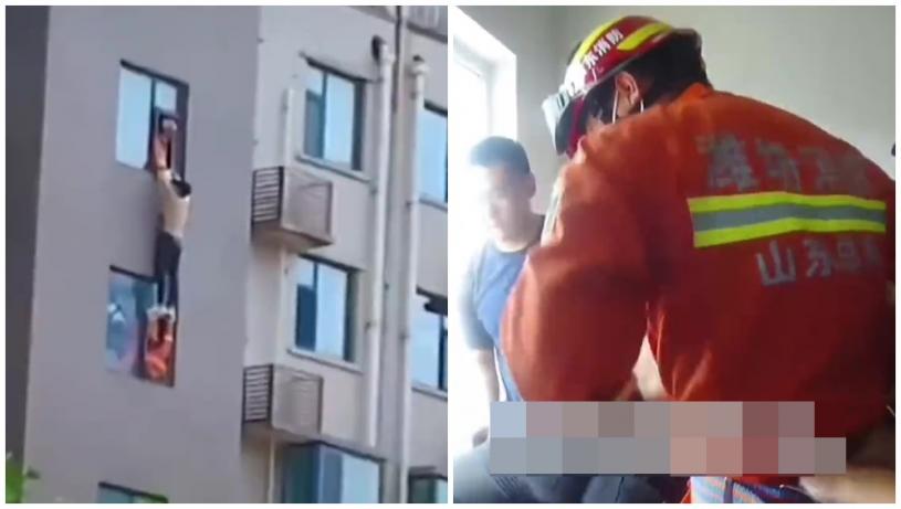 山東濰坊市一名男子近日空懸在6樓窗台外,只憑一雙手攀住窗緣,命懸一線,所幸消防員及時到場,才保住一命。