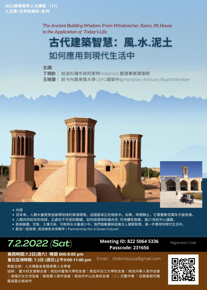 人文磚暨美華人文學會將於七月二日(周六晚上)舉辦線上人文講座。2022美華文藝季春季講座(11),主題為「古代建築智慧: 風.水.泥土,如何應用到現代生活中 」。也是本季最後一個講座。將由二位講員分享他們考察伊朗風塔、坎兒井,中國黃土高原窯居、地坑院,並如何利用天然資源、地形、古人智慧到現代人生活中,並成為地球可持續性目標的綠色夥伴。本講座將會從風水,泥土談到上古時代各區域的人文與科技。