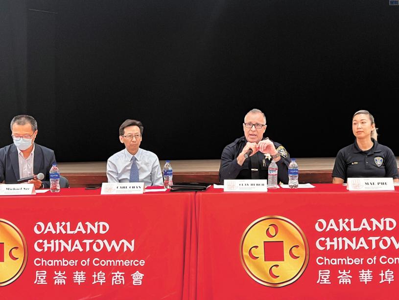 符美同警局外勤行動第一區大隊長博琪(Clay Burch)、華埠防罪委員會聯合主席時晨光(Michael Sze)、屋崙華埠商會會長陳錫澎,昨午在商會主辦的首次「與屋崙警局大隊長對話」華埠社區會議中擔任主講嘉賓。屋崙副局長比爾(James Beere)和黃家華(Clifford Wong)以及多位巡邏警員也出席,感謝華埠社區的支持並對如何打擊仇恨犯罪進行討論。