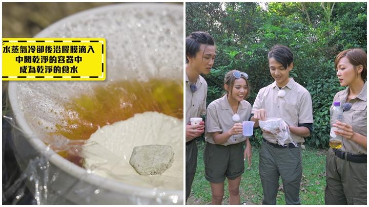 第2項任務、即自製飲用水時,Sandy、Liam的「鞋帶」山澗引水及「襪仔」過濾法皆不成功,最後方法落在Arthur的尿液蒸餾法上,最後真的成功提鍊出小半杯水,Sandy見狀已急不及待走去聞,嚇到在旁的Inez忍不住大叫︰「好大膽呀,呢個女子。」各人最後分甘同味,Liam形容「飲尿」的感覺︰「我想像有餲味,結果又冇。」另外,Arthur尋找食物期間找到一大堆菇類,當他沾沾自喜介紹時,卻忽然面色一變並向攝製隊說:「等陣先,我隻手痺咗呀!」最後要Inez出手為他解毒。