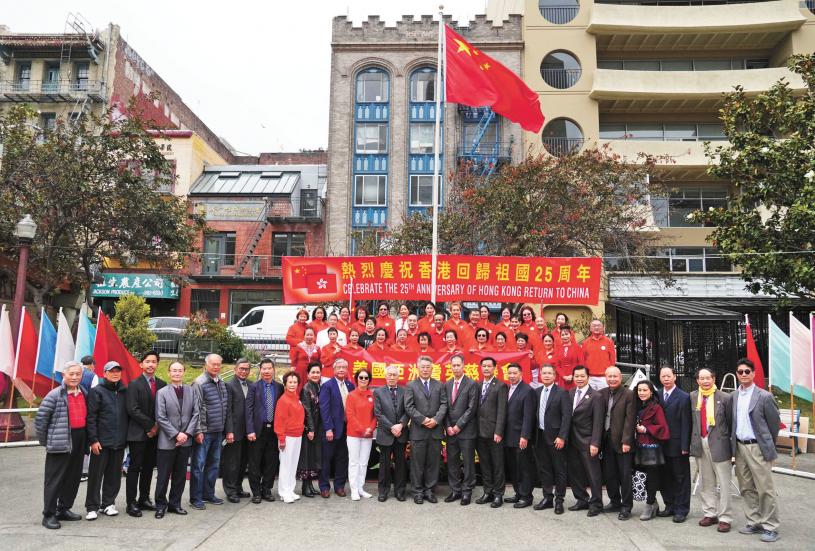 由美國華商總會主辦,聯合灣區各界華人慶祝香港回歸祖國25週年活動,7月1日在三藩市華埠花園角舉行。在《義勇軍進行曲》歌聲中,五星紅旗在麗日藍天下徐徐升起。