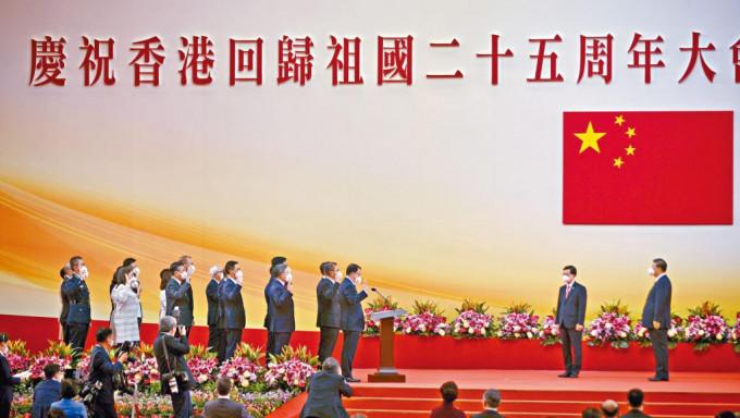 (星島日報報道)香港特別行政區第六屆政府就職典禮昨早舉行,新任行政長官李家超在中共中央總書記、國家主席、中央軍委主席習近平監誓下宣誓就任。整個新班子「三司十五局」的主要官員在習近平監誓下宣誓就職,包括早前確診的政務司司長陳國基和政制及內地事務局局長曾國衞。李家超在宣誓後的就職致辭中承諾,管治團隊會以改革精神,自我挑戰及創新,提升管治效能,為市民解困。